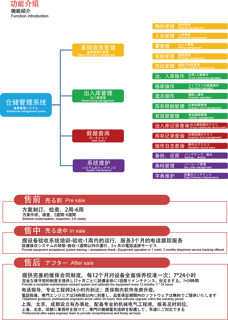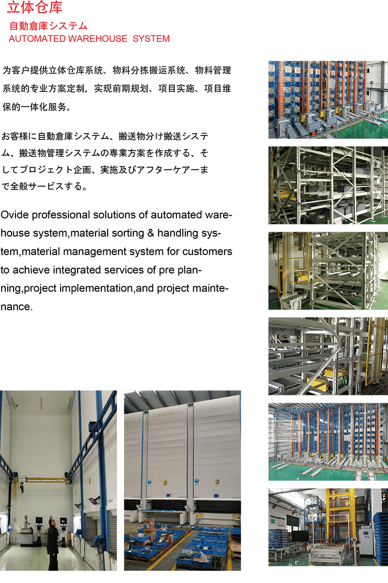 Ang kumpanya ay dalubhasa sa pagbibigay ng mga propesyonal na solusyon para sa awtomatikong three-dimensional na mga sistema ng bodega, materyal na pag-uuri at paghawak ng mga sistema, at mga sistema ng pamamahala ng materyal. Ang mga solusyon na ito ay ganap na isinama, tinitiyak na ang bawat yugto ng proseso, mula sa disenyo at pagpapatupad hanggang sa patuloy na suporta, ay nasasakop. Sa pamamagitan ng isang masigasig na pag -unawa sa mga pangangailangan ng kliyente, ang mga serbisyo ng Wuxi Huiqian ay napapasadya, tinitiyak na ang bawat system ay naayon para sa pinakamainam na pagganap.