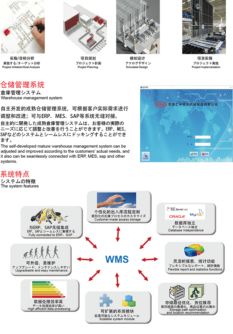 Ang diskarte sa Wuxi Huiqian ay ang Advanced Warehouse Management System (WMS), isang nababaluktot na platform na maaaring ipasadya upang matugunan ang mga tiyak na pangangailangan ng bawat customer. Ang sistemang binuo ng sarili na ito ay nagsasama nang walang putol sa ERP, MES, SAP, at iba pang mga tool sa pamamahala ng negosyo, na nagpapahintulot sa pagsubaybay sa real-time, control ng imbentaryo, at pinahusay na kakayahang makita ng data. Sa pamamagitan ng pag-aalok ng mga modular na tampok tulad ng in-and-out na pamamahala ng imbakan, pagpapanatili ng system, at mga kakayahan sa query ng data, sinusuportahan ng WMS ang mga negosyo sa pamamahala ng lahat mula sa mga pangunahing pag-andar ng bodega sa mas kumplikadong mga gawain ng logistik.