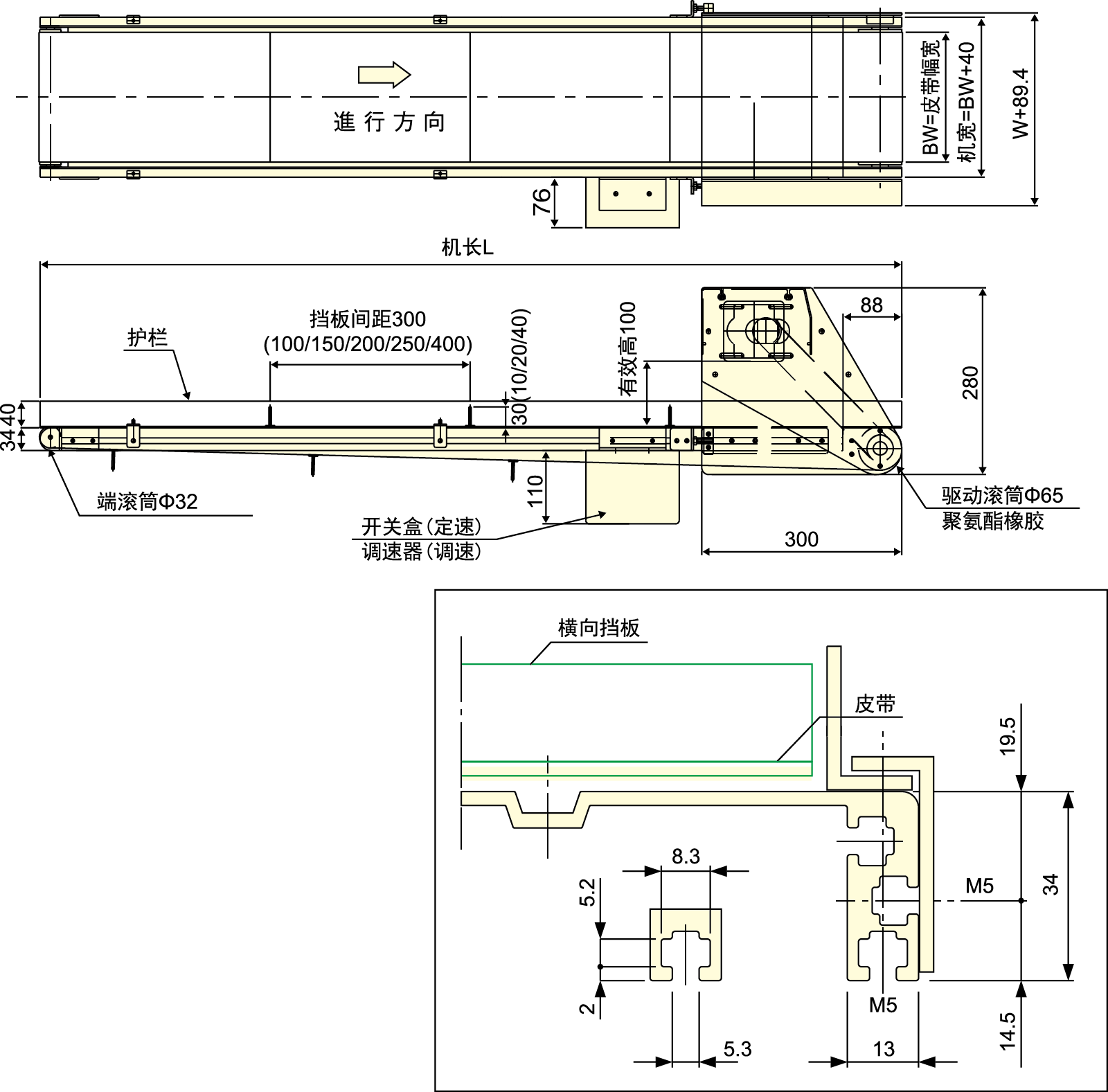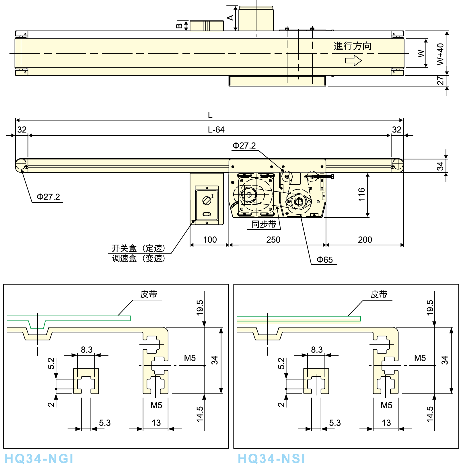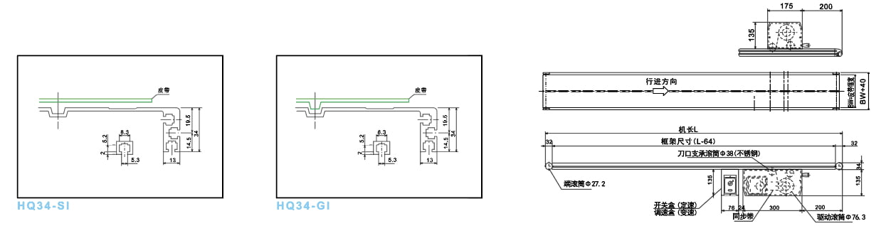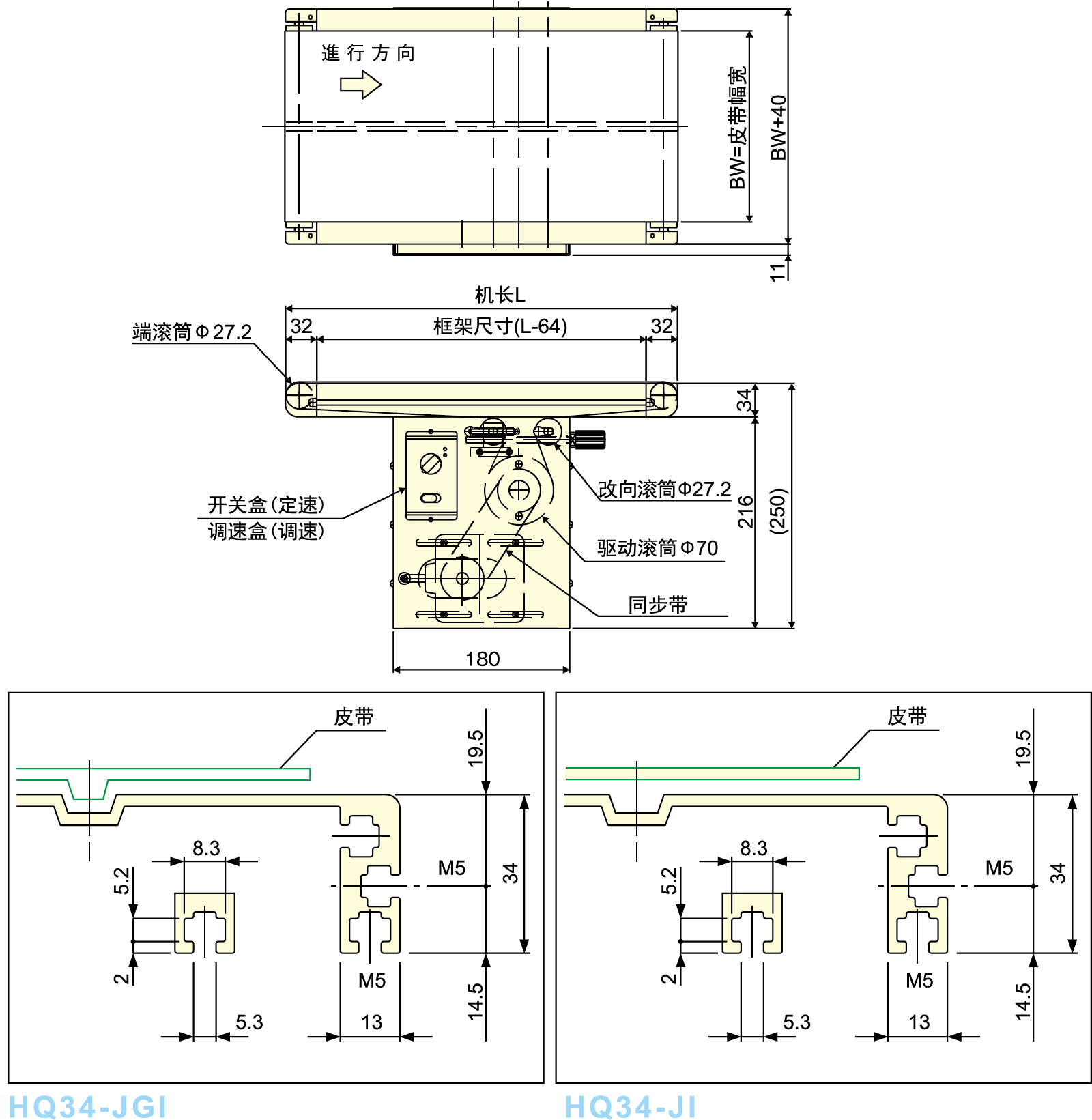 ● Ito ay karaniwang uri ng 34mm belt conveyor, ang sentro ng pagmamaneho ay inilipat ng tiyempo.