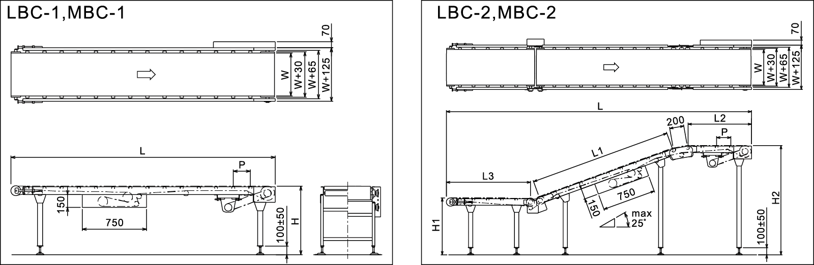 | Lapad ng conveyor | W (mm) | BW 125 | BW 125 | BW 125 | BW 125 |