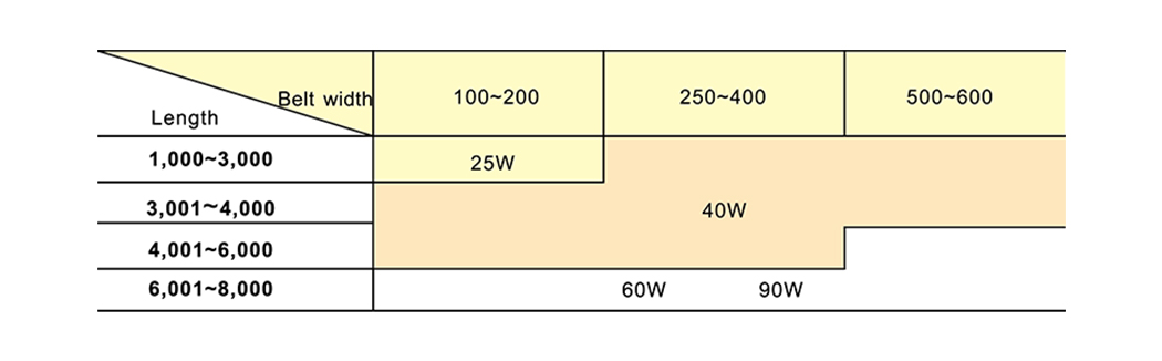 | Haba ng conveyor | 500 | 1,000 | 1,500 | 2,000 | 2,500 | 3,000 | 3,500 | 4,000 | 5,000 | 6,000 |
