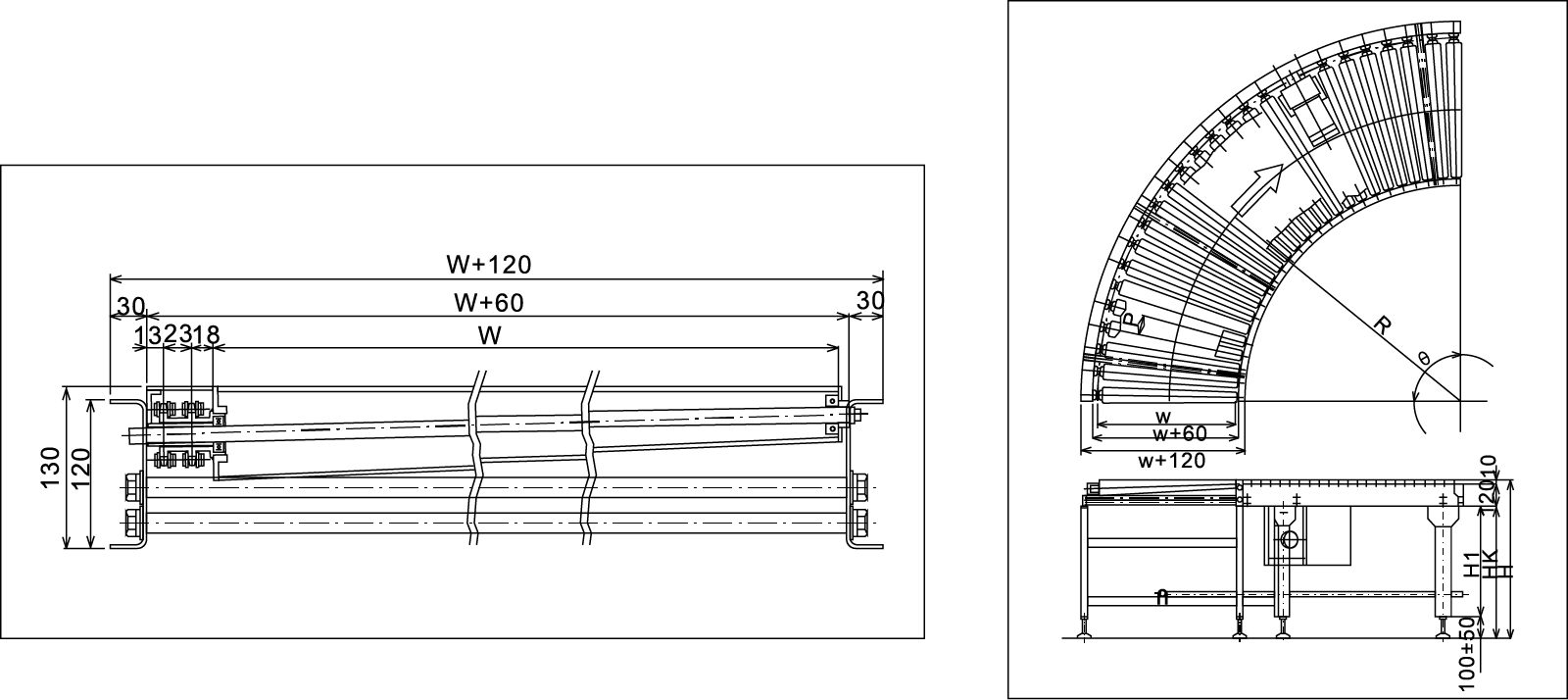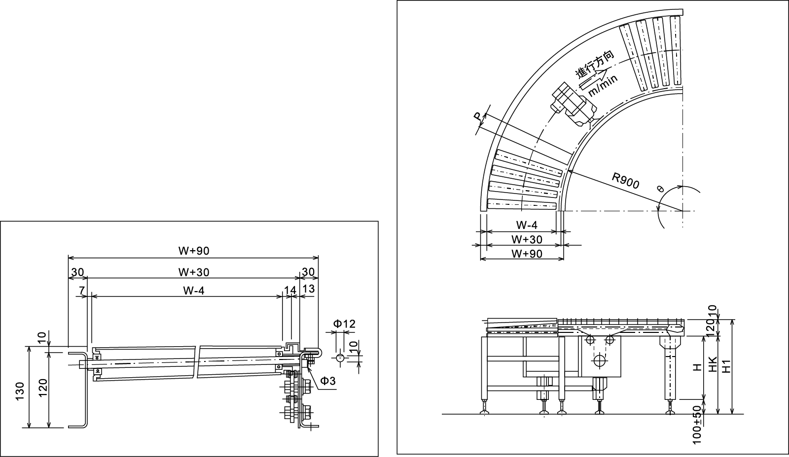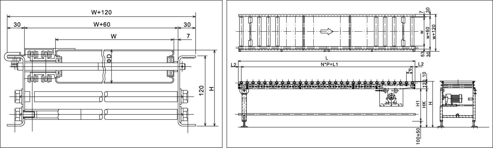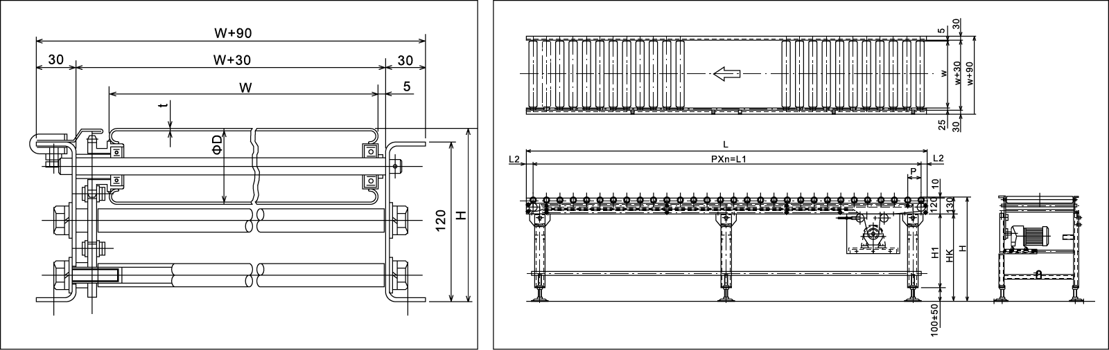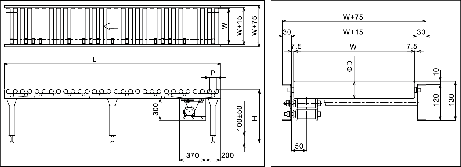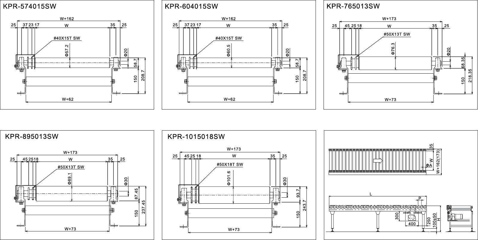 | Roller pitch | P (mm) | 50 75 100 | 50 75 100 | 75 100 | 75 100 | 75 100 | 75 100 |