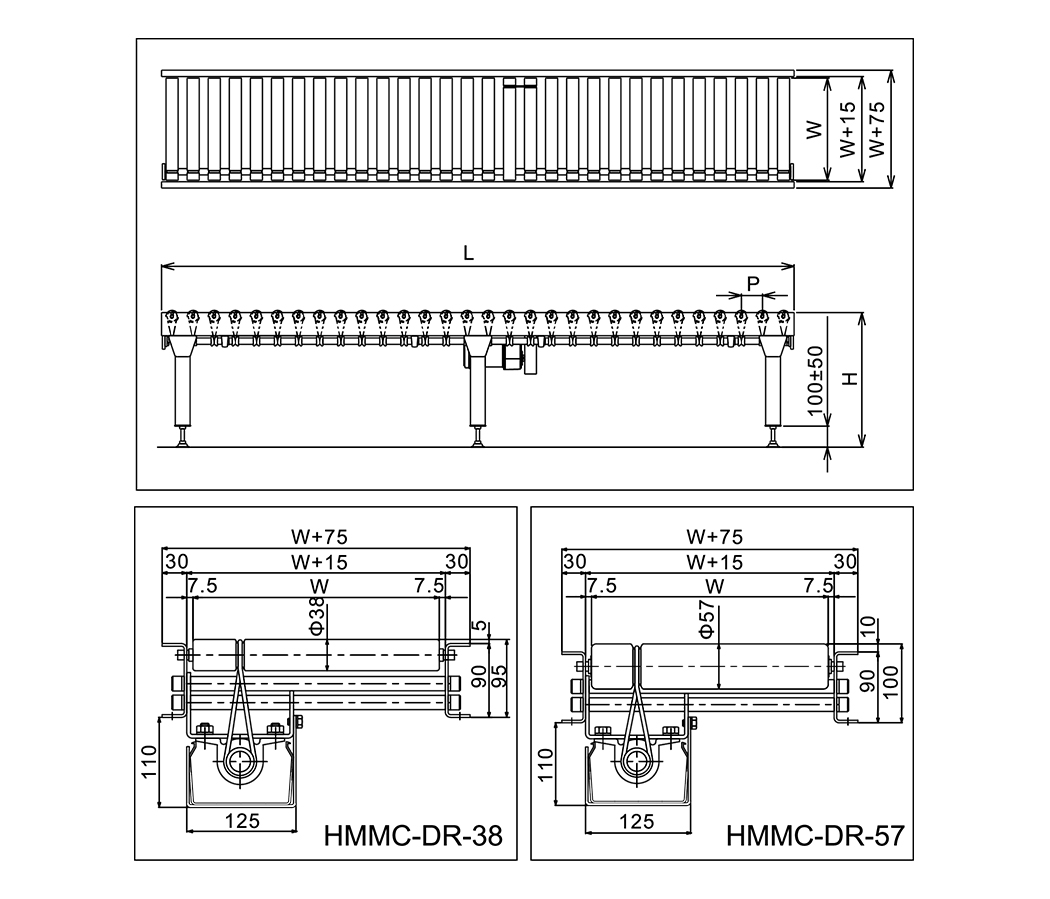 | Roller pitch | P (mm) | 75 · 100 · 150 | 75 · 100 · 150 | 75 · 100 · 150 | 100 · 150 | 100 · 150 |