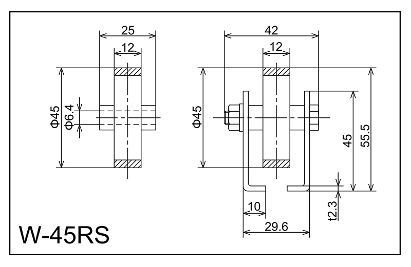 | W-45RS | 45x12x6.4x25 | M6X38L | 45x29.6x10x42x2.3 | 55.5 | 1800 · 2400 · 3000 | 50 · 75 · 100 · 150 | 10 | A | NBR |